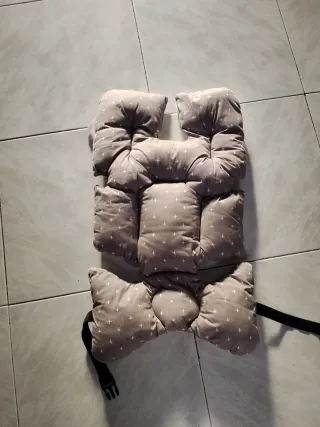 Cojín acolchado para silla de paseo de bebé. Su diseño se adapta a la mayoría de las sillas. - Tejido suave y confortable. - Estampado de cruces blancas sobre fondo gris.