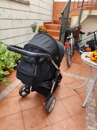 Silla de paseo en color negro, con estructura metálica y capota. - Capota extensible. - Ruedas delanteras giratorias. - Cesta de almacenamiento inferior.Alguna pequeña señal de uso, se ha usado muy poco