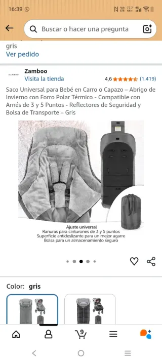 Saco universal para silla de paseo o capazo, ideal para el invierno. Es compatible con arneses de 3 y 5 puntos. - Color gris. - Forro polar térmico. - Incluye reflectores de seguridad. - Viene con bolsa de transporte.