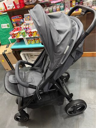 Silla de paseo ligera y compacta, ideal para el día a día. - Diseño moderno en color gris y negro. - Capota para proteger del sol. - Arnés de seguridad de 5 puntos. - Reposapiés. - Ruedas delanteras giratorias.