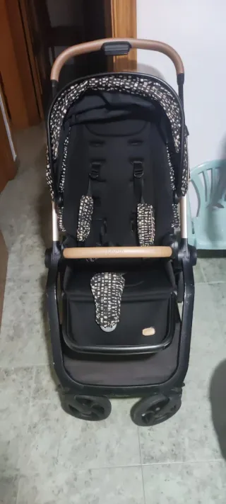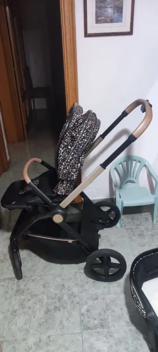 Bien conservado. en Amazon comprado por 300 euros. Conjunto de carrito de bebé 3 en 1 en color negro con detalles en dorado. Incluye varios accesorios para mayor comodidad. - Silla de paseo. - Capazo. - Silla de coche. - Bolso. - Mosquitera. - Protector de pies. - Portabebidas.