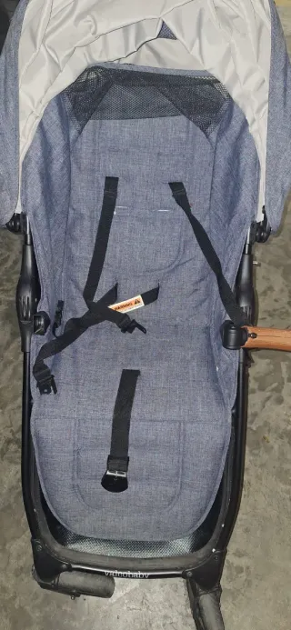 Se vende silla de paseo Stokke en color gris y azul, ideal para transportar a los más pequeños. - Estructura plegable. - Ruedas resistentes. - Asiento reclinable.