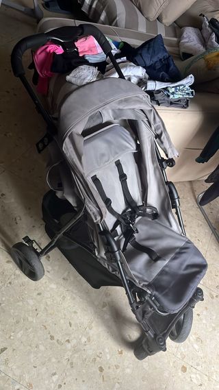 Silla de paseo gemelar de la marca Niu, modelo Vent Twin. - Asientos acolchados. - Capotas independientes. - Manillar ergonómico. - Ruedas delanteras giratorias. - Viene con sacos para la silla. -Viene con plasticos para la lluvia. Comprada en el corte ingles 3 octubre 2025. Garantia. Tengo ticket guardado. Usada solo una vez. Se puede ver en la rueda. La limpiaria anntes de enviar