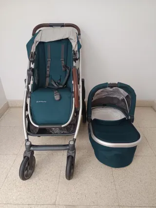 Se vende conjunto de silla de paseo Uppababy Cruz V2 con capazo. - Capazo prácticamente nuevo, muy poco uso - Color verde azulado oscuro. - Capazo con interior blanco y exterior a juego. - Silla con arnés de seguridad. - Empuñadura y barra de seguridad en polipiel marrón.