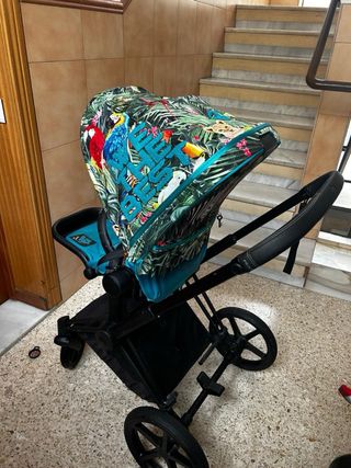 Preciosa silla de paseo Cybex con capota estampada. Está en muy buen estado y lista para usar. - Incluye silla de paseo y capota. - Diseño tropical con estampado de loros. - Color turquesa y negro.