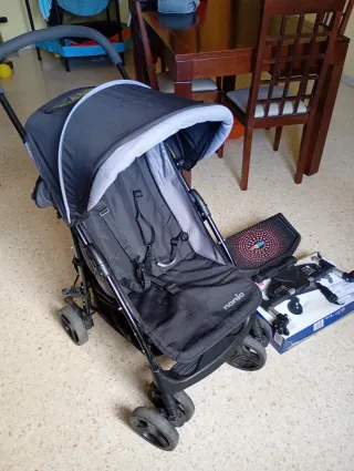 Se vende silla de paseo marca Nania junto con uno patinetes para hermanos. - Silla de paseo plegable. - Incluye uno patinetes porta hermanos. - Color gris y negro.