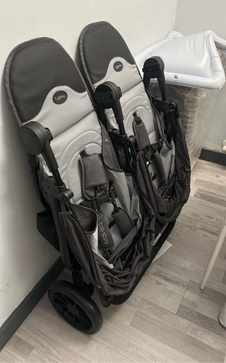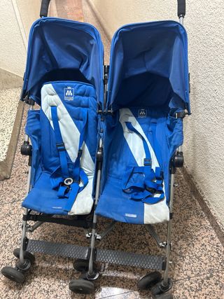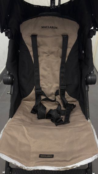 Silla de paseo doble de la marca Maclaren, ideal para hermanos o gemelos. Diseñada para ofrecer comodidad y practicidad. - Color negro con detalles en blanco. - Capotas independientes. - Arnés de seguridad de 5 puntos. - Incluye plástico de lluvia.