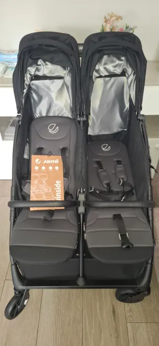 Silla gemelar Jane Twinside en color negro, ideal para hermanos con poca diferencia de edad. Incluye capazo. - Chasis ligero y compacto. - Asientos reclinables. - Capotas amplias. - Cesta de almacenaje. - Incluye burbuja de lluvia.