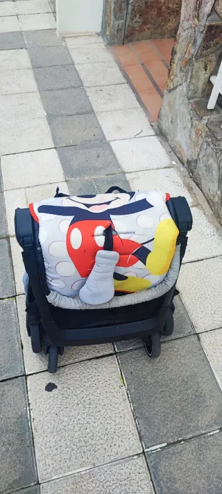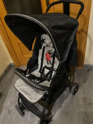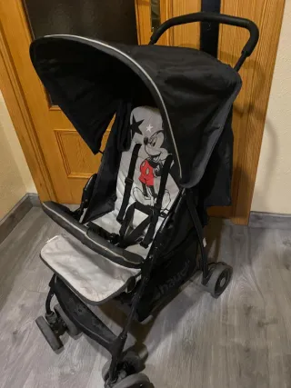 Silla de paseo con diseño de Mickey Mouse. - Capota amplia. - Arnés de seguridad. - Ruedas delanteras giratorias. - Plegable para facilitar su transporte. Regalo plastico y una funda