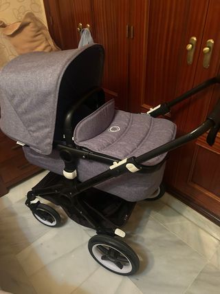 Carro Bugaboo en color gris jaspeado. - Capazo y silla. - Capota extensible. - Ruedas todoterreno. Incluye dos capotas,plástico de lluvia,colchoneta de verano para silla,bolso organizador y saco de invierno para silla de paseo.