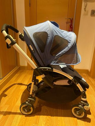 Silla de paseo BUGABOO BEE 3 en color negro y funda de color azul. Incluye: - Estructura metálica. - Ruedas delanteras giratorias. - Cesta de almacenamiento inferior.