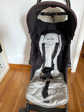 Silla de paseo Maclaren en color negro. - Diseño ligero y plegable. - Capota. - Cesta de almacenamiento. - Ruedas delanteras giratorias.