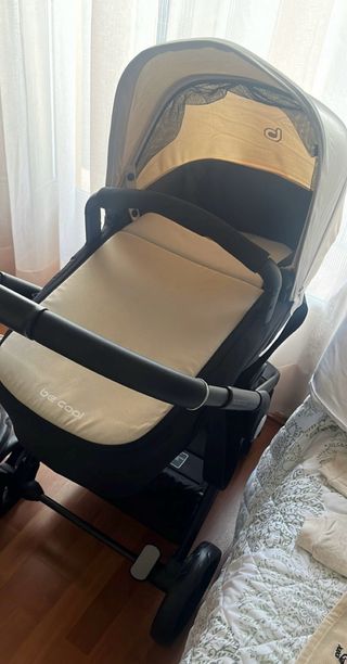 Carro de bebé de la marca Be Cool, que incluye capazo y silla de paseo plegable y con respaldo multiposición. - Color beige y negro. - Capazo y silla de paseo incluidos. Precio negociable