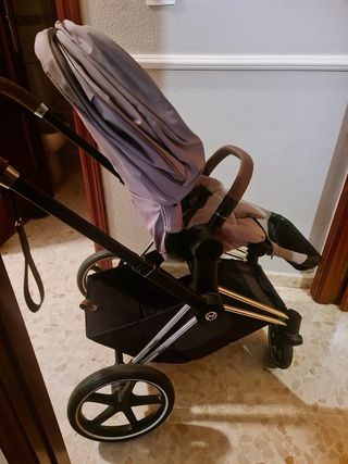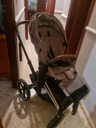 Silla de paseo Cybex Priam en color beige y detalles en marrón. - Chasis negro. - Capota extensible. - Barra de seguridad. - Reposapiés ajustable. - Ruedas todoterreno.