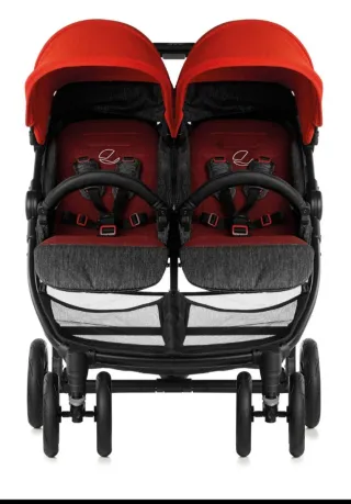 Cochecito gemelar de la marca EasyWalker, ideal para dos niños. - Diseño en color oscuro - Capotas independientes. - Arnés de seguridad de 5 puntos. - Incluye funda para lluvia - Facil plegado - Neumáticos todo terreno