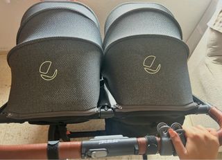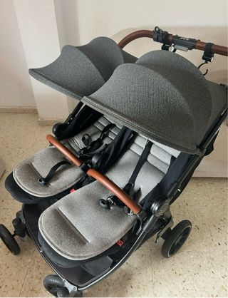 Carro gemelar de la marca Jane, ideal para dos bebés. - Diseño moderno y funcional. - Capotas para mayor protección. - Chasis resistente y ligero. - Asientos cómodos y acolchados.