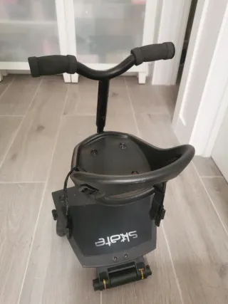 Plataforma y asiento para patinete marca Skate de Be Cool. Se encuentra en buen estado. Un niño puede ir sentado y otro de pie. Funciona perfectamente. Trae los dos tipos de agarres para adaptarse a cualquier carrito de bebé o silla de paseo. - Plataforma con diseño. - Asiento integrado. - Color negro.