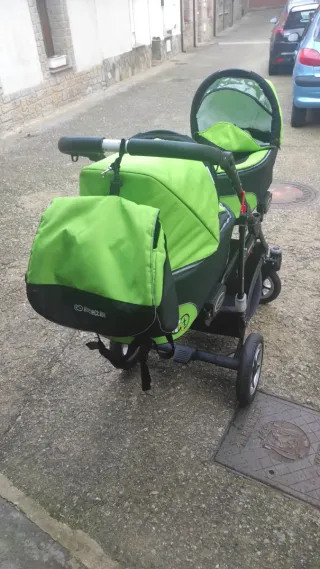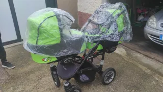 Silla gemelar en color verde y negro, con fundas protectoras transparentes. - Dos capotas independientes. - Chasis resistente. - Ruedas todoterreno. -Incluye ruedas de repuesto