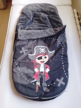 Saco para silla de paseo con un divertido diseño de pirata. - Estampado de mapa del tesoro y pirata. - Interior suave y cálido. - Color gris oscuro.