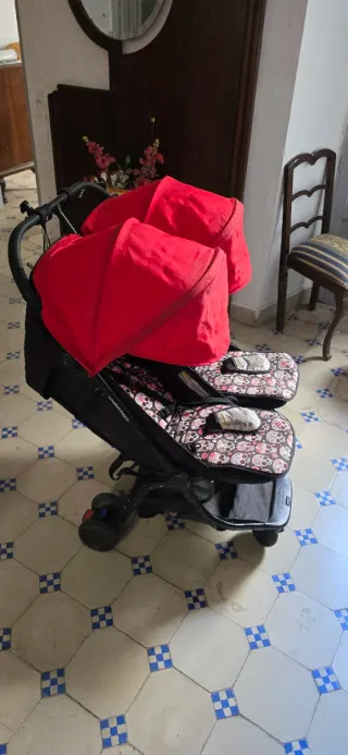 Sillita gemelar plegable Mountain Buggy, ideal para transportar a dos niños cómodamente. Tremendamente cómoda para plegaria. - Capotas amplias para proteger del sol. - Asientos acolchados, se incluye asientos personalizados de diseño de calaveras. - Estructura ligera y fácil de plegar.