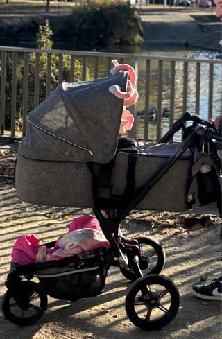 Carro Joolz Day Plus en color beige, conjunto completo que incluye: ∙ Chasis ∙ Capazo ∙ Silla de paseo ∙ Mosquitera original ∙ Burbuja de lluvia ∙ Bolsa original Joolz Estado: La estructura presenta ligeros arañazos de uso normal. La barra de seguridad (bumper bar) tiene desgaste en la zona central, pero es una pieza intercambiable disponible en varios colores en la web de Joolz. Funciona perfectamente.