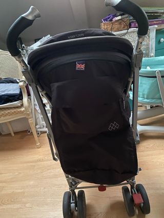 Silla de paseo Maclaren Quest en color negro y gris. Es ligera y fácil de plegar. - Capota. - Arnés de seguridad. - Reposapiés. - Ruedas delanteras giratorias. Incluye saco de invierno