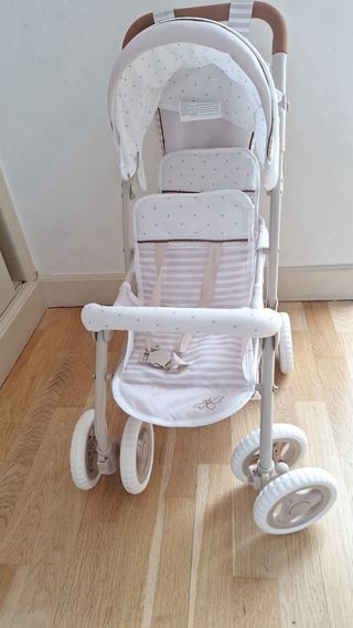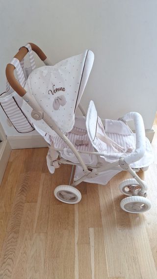 Silla de paseo para muñecas gemelar, modelo Verona. Ideal para jugar a ser padres. - Diseño en tonos beige y blanco con detalles de lunares. - Incluye capota y cesta de almacenamiento. - Asas acolchadas para un agarre cómodo. - Tejido con estampado de rayas en la cesta.