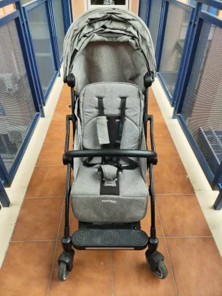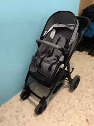 Silla de bebé con un diseño moderno y funcional. - Tejido gris. - Cinturón de seguridad. - Ruedas con detalles amarillos. - Al plegar sirve también como silla de coche. Lo compré porque mi ascensor es muy pequeña y me hizo el apaño de llevar y traer a mi hijo grande del cole.
