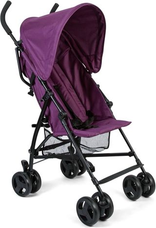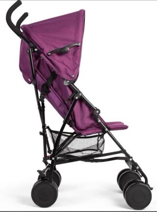 Silla de paseo plegable, ideal para llevar a tu bebé contigo a todas partes. Es compacta y fácil de manejar. - Color morado. - Estructura metálica. - Ruedas dobles delanteras y traseras. De 6 meses hasta 15kg. Dos posiciones de respaldo. Asiento acolchado, ruedas giratorias bloqueables y toldo extraíble. Arnés de 5 puntos de valor. Con cesta