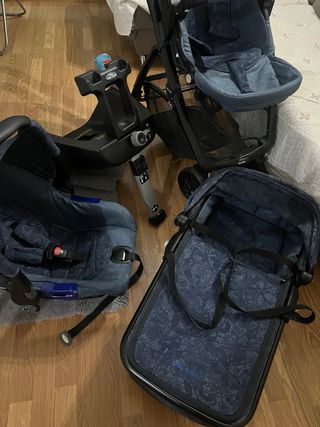 Conjunto de cochecito de bebé de 3 piezas con un diseño moderno y funcional. - Incluye capazo, silla de paseo y base para el coche. - Tapicería en tono azul con estampado. - Estructura resistente y plegable.