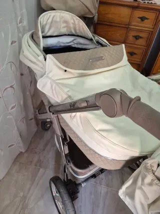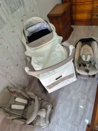 Conjunto de cochecito de bebé en color blanco roto y beige. Está como nuevo, mi bebe nació un par de meses antes de comenzar la pandemia y no se a llegado usar. Merece la pena! Está impecable. El carro va foreazo de piel entero, la, sillita de paseo y la del coche tiene detalles en piel tambien. - Capazo espacioso. - Silla de paseo. - Silla de coche. - Incluye accesorios.
