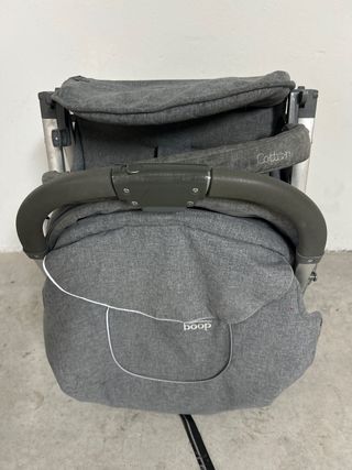 Silla de paseo en color gris, con detalles en blanco y el nombre de la marca boop bordado. - Capota con texto Cotton bordado. - Asa de manejo gris. - Diseño moderno y funcional.