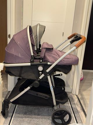 Cochecito de bebé en color marrón, ideal para paseos cómodos. Silla para cuando el bebe pueda sentarse. - Capota amplia para proteger del sol. - Asa de manejo ergonómica. - Incluye bolso a juego. - Diseño moderno y funcional.