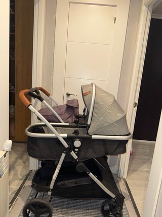 Conjunto de carro de paseo para bebé y silla de seguridad para coche. - Carro de paseo con capota. - Silla de coche. - Ruedas delanteras giratorias. - Cesta de almacenamiento inferior.