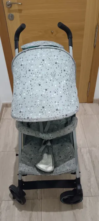 Silla de paseo ligera con un divertido estampado de estrellas y detalles en color turquesa. Es compacta y fácil de manejar. - Diseño con estrellas plateadas y fondo color turquesa . - Capota con interior en color turquesa. - Barra delantera. - Arnés de seguridad.