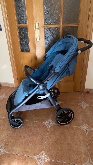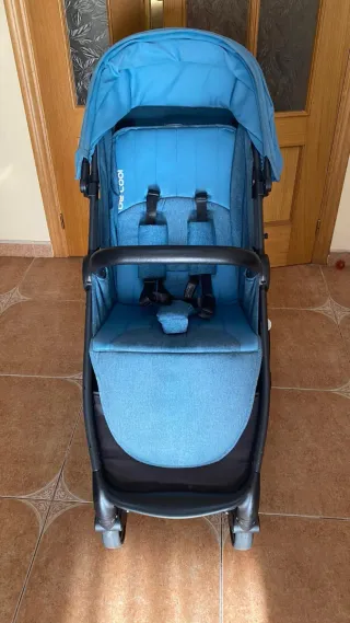 Silla muy amplia, Color vaquero, capota extensible, tirantes, ventanilla, burbuja lluvia, sombrilla, pañalera, ganchos para colgar...