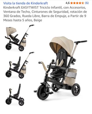 Triciclo infantil Kinderkraft EASYTWIST en color beige. Ideal para niños de 9 meses a 5 años. - Asiento con rotación de 360 grados. - Ventana en el techo. - Cinturones de seguridad. - Rueda libre. - Barra de empuje.