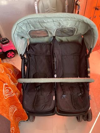 Silla gemelar Niu Ventt Twins en color gris y negro. - Capota extensible. - Cesta de almacenamiento. - Ruedas delanteras giratorias.