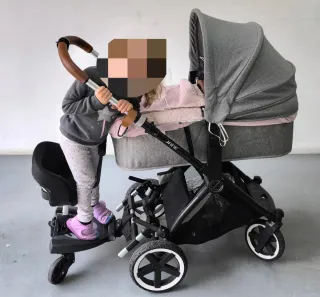 Accesorio para silla de paseo que permite a un niño mayor viajar sentado. - Plataforma con diseño antideslizante. - Asiento acolchado. - Manillar con empuñaduras de goma. - Correas de sujeción. - Ruedas para facilitar el movimiento.