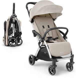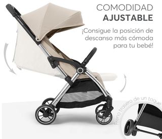Silla de paseo ligera y práctica, ideal para llevar a los más pequeños. - Color beige y negro. - Capota. - Arnés de seguridad. - Ruedas delanteras giratorias.