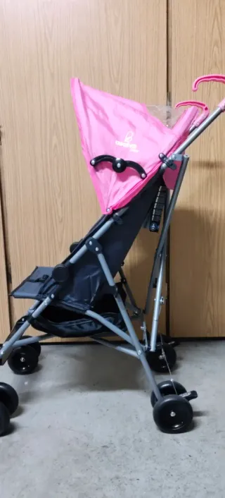 Silla de paseo ligera en color rosa, ideal para transportar a los más pequeños. - Sin usar - Capota ajustable. - Cesta de almacenamiento inferior. - Ruedas delanteras giratorias.