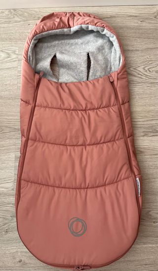 Saco acolchado para silla de paseo en color rosa. El interior es de tejido gris suave. - Diseño acolchado. - Forro interior de tejido polar. - Aberturas para el arnés de la silla. - Cremalleras laterales para facilitar el acceso. - Logo de la marca Bugaboo en la parte frontal. Repelente al agua y thermolite en el interior.