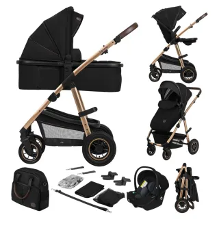 Conjunto de carro plegable y ruedas desmontables con silleta de bebé para transporte en vehiculo/carro de la marca Kiduku en color negro con detalles dorados. Incluye varios accesorios para mayor comodidad. Cochecito de paseo con - Silleta de transporte. - Capazo. - Saco. - Mosquitera. - Adaptadores para silla de coche. - Accesorios para el cochecito. - Comedero. - Agarrador de seguridad. - Fúnda impermeble. - Posabasos.