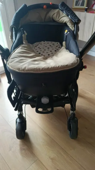 Se vende cochecito de bebé en buen estado. Es cómodo y fácil de manejar también es silla de paseo como se observa en el círculo verde y trae muchos accesorios - Color negro y beige. - Incluye capota. - Ruedas giratorias.