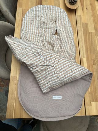 Saco de la marca Pasito a Pasito, ideal para silla de paseo y carro. - Diseño elegante en color gris/clarito - Incluye bolsa de transporte. - Logo de la marca visible.
