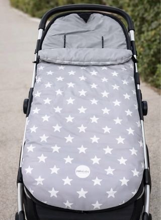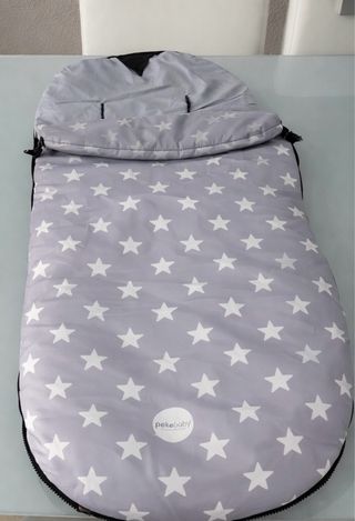 Saco para silla de paseo con un divertido estampado de estrellas blancas sobre fondo gris. Es acolchado y protege al bebé del frío. - Impermeable y para temperatura media - Marca: pekebaby. Únicamente tiene deteriorado el broche lateral, como se aprecia en la foto.