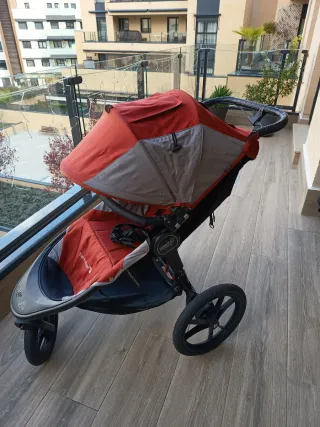 Silla de paseo Baby Jogger Summit X3 en color rojo y gris. Ideal para todo tipo de terrenos. - Ruedas grandes para mayor maniobrabilidad. - Capota extensible. - Asiento reclinable.