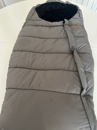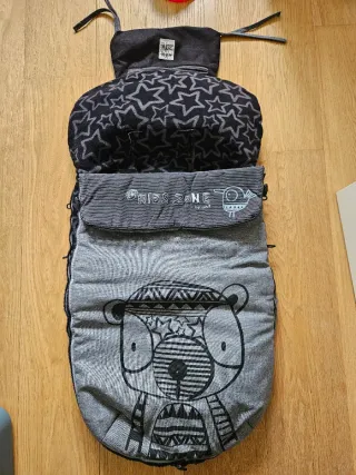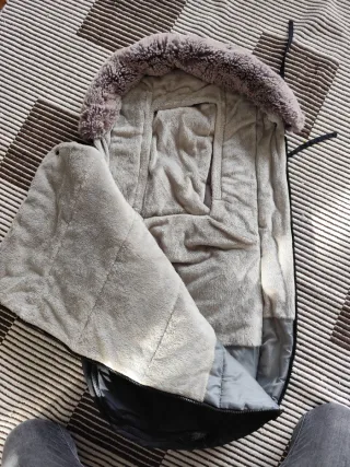 Saco de silla de paseo universal, ideal para mantener a tu bebé abrigado durante los paseos. Es de color negro con detalles en gris y tiene un diseño muy bonito. Se ha usado un par de veces - Se adapta a la mayoría de sillas de paseo. - Incluye una capucha forrada de borreguito suave. - Cremallera frontal para facilitar su uso. - Tejido exterior resistente al agua.