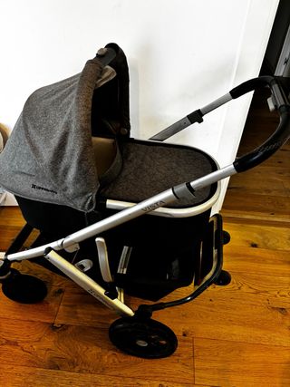 Vendo cochecito Uppababy Cruz V2 en muy bien estado y lavado. Es de buena calidad y tiene cesta grande. - Incluye silla y capazo, protecion de lluvia y mosquetera. - Color gris beige claro (Sierra) - Se pliega fácilmente para guardarlo. Vendo mas accesorios: adaptadores para la silla Maxicosy.