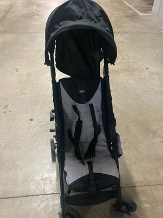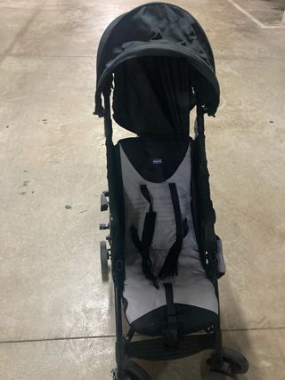 Silla de paseo Chicco en color negro y gris. Es ligera y fácil de plegar. - Capota. - Arnés de seguridad. - Ruedas. -Le falta la barra de delante. Pero el cinturon esta bien